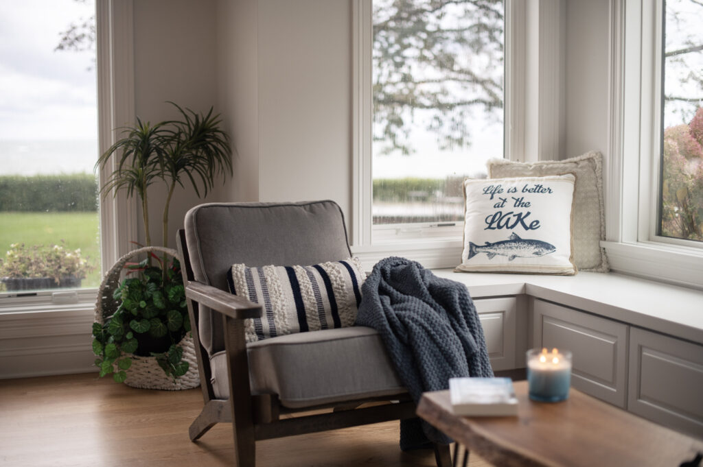 Arriving on a crisp winter afternoon, unpacking in a modern, lakeside living room